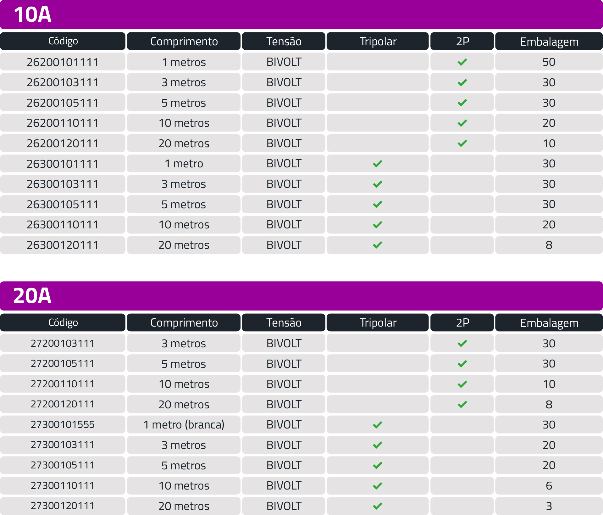 As extensões Connect Hard Fiolux, disponíveis em 10A e 20A, foram projetadas para fornecer energia em locais distantes dos pontos fixos do ambiente. Fabricadas com materiais de alta qualidade e tecnologia de ponta, elas seguem o Padrão Fiolux de alta performance. A linha Connect Hard oferece praticidade e segurança, com opções de 1m, 3m, 5m, 10m e 20m, nas cores preto e branco, e com conexões 2P e 2P+T.